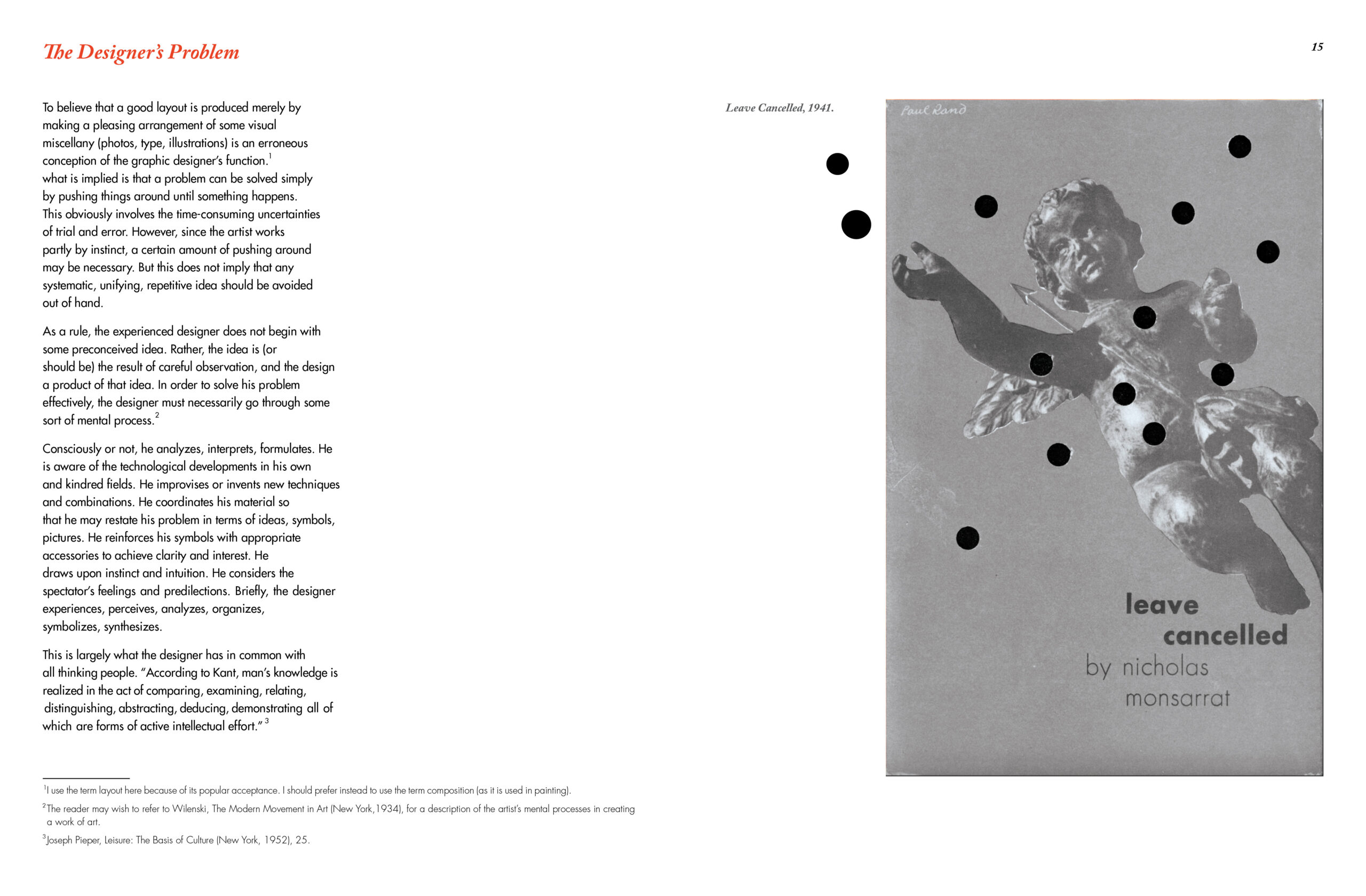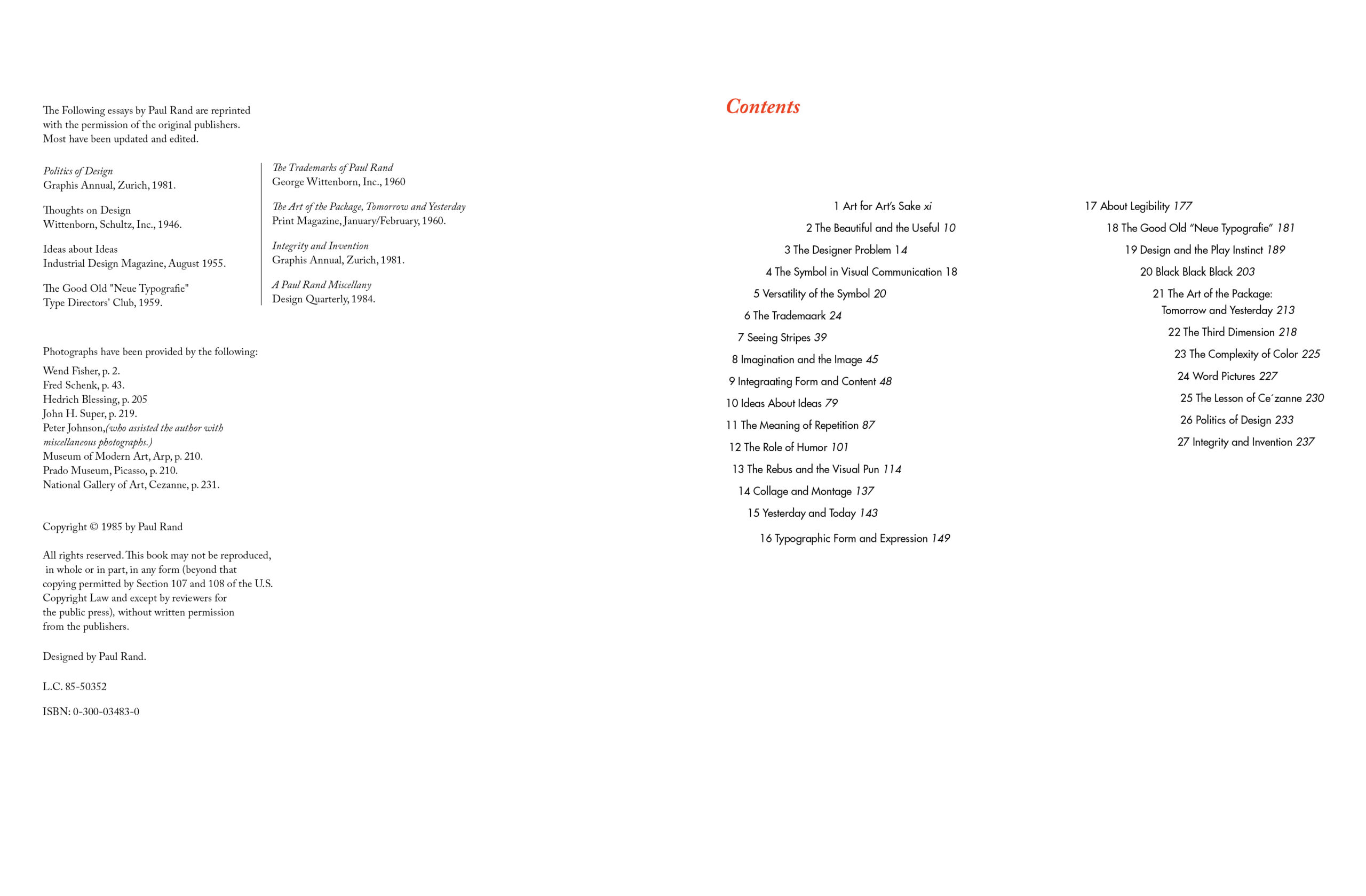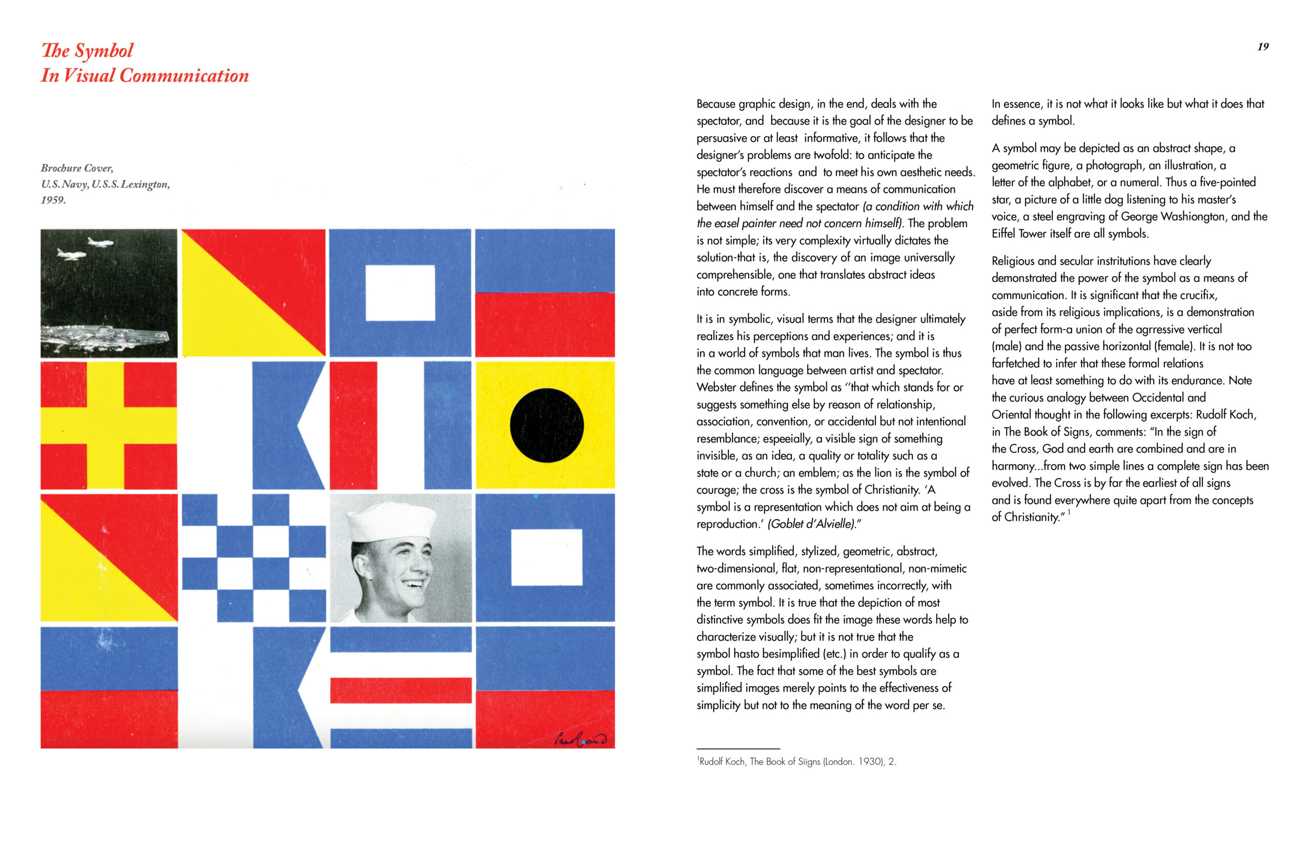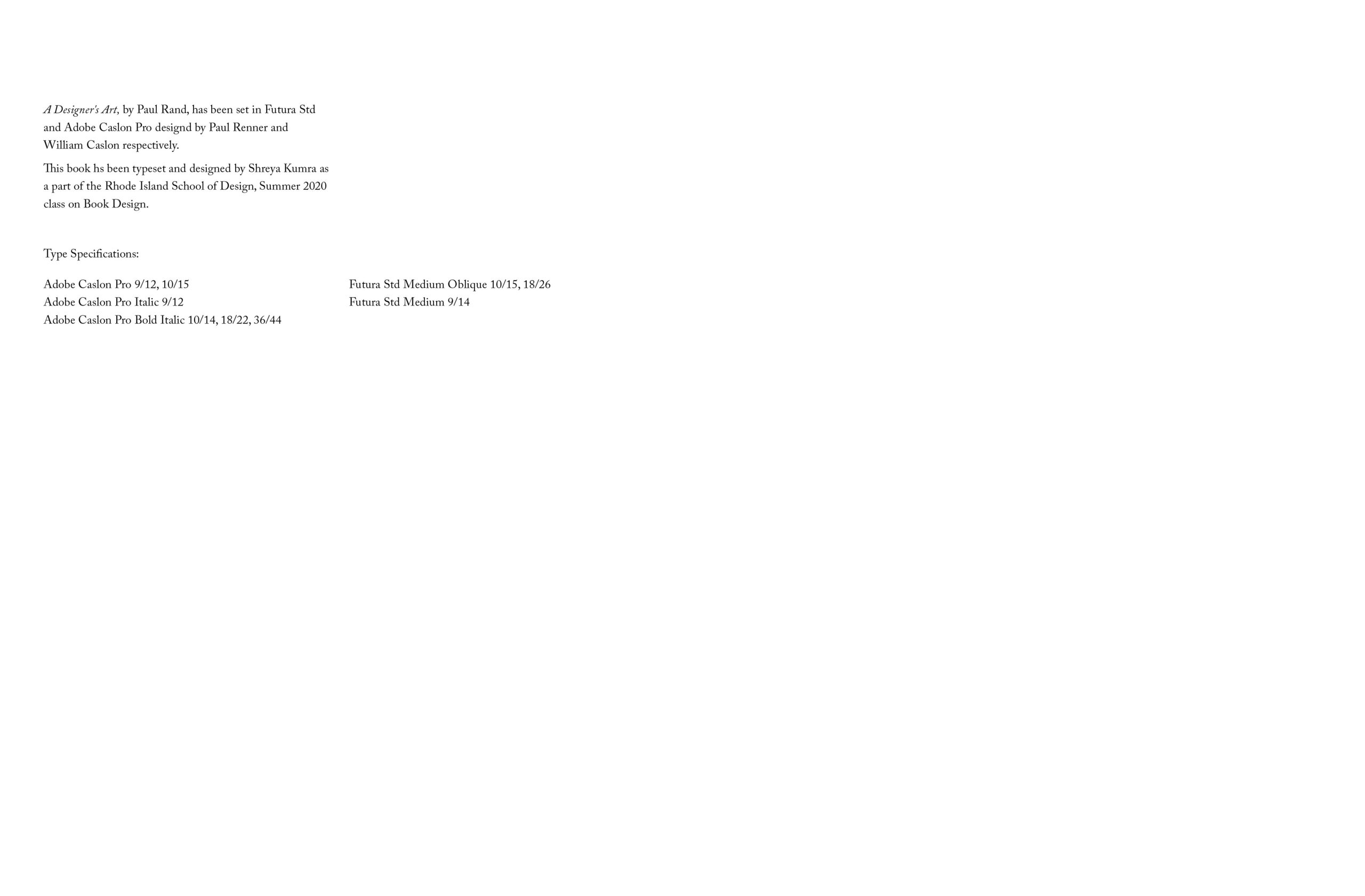 This Image and Text Book is a comprehensive collection of Paul Rand’s most well-known designs, providing readers with an in-depth look at Rand’s design process and critical theory. A Designer’s Art, by Paul Rand, has been thoughtfully set in Futura Std and Adobe Caslon Pro, designed by Paul Renner and William Caslon, respectively. The attached spreads from the book illustrate its design and scope. The book’s dimensions are 8 x 10 1/2 inches per page, with a spread size of 16 x 10 1/2 inches.