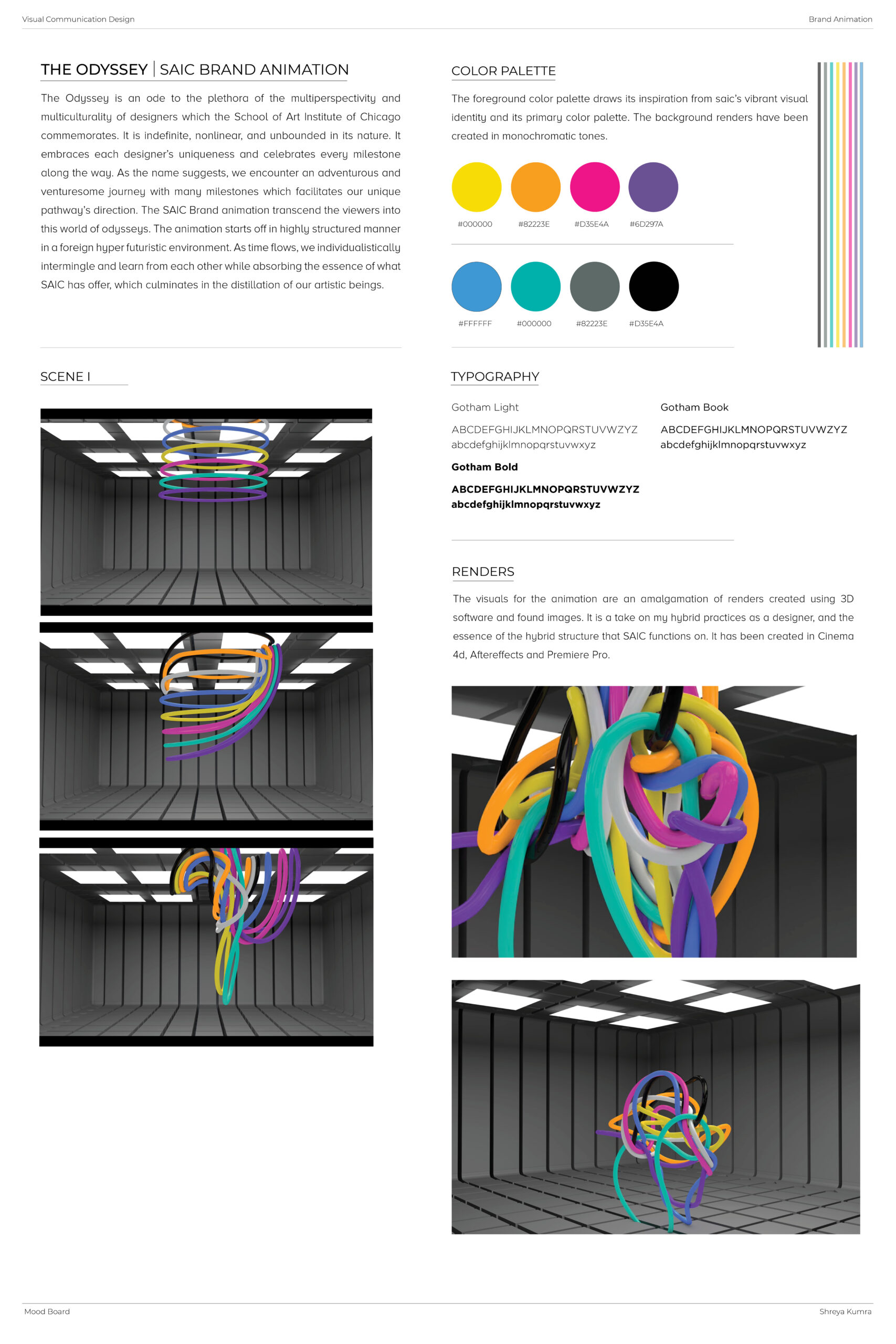 The Odyssey is an ode to the plethora of the multiperspectivity and multiculturality of designers which the School of Art Institute of Chicago commemorates. It is indefinite, nonlinear, and unbounded in its nature. It embraces each designer’s uniqueness and celebrates every milestone along the way. As the name suggests, we encounter an adventurous and venturesome journey with many milestones which facilitates our unique pathway’s direction. The School of the Art Institute of Chicago’s brand animation transcend the viewers into this world of odysseys. The animation starts off in highly structured manner in a foreign hyper futuristic environment. As time flows, we individualistically intermingle and learn from each other while absorbing the essence of what SAIC has offer, which culminates in the distillation of our artistic beings.