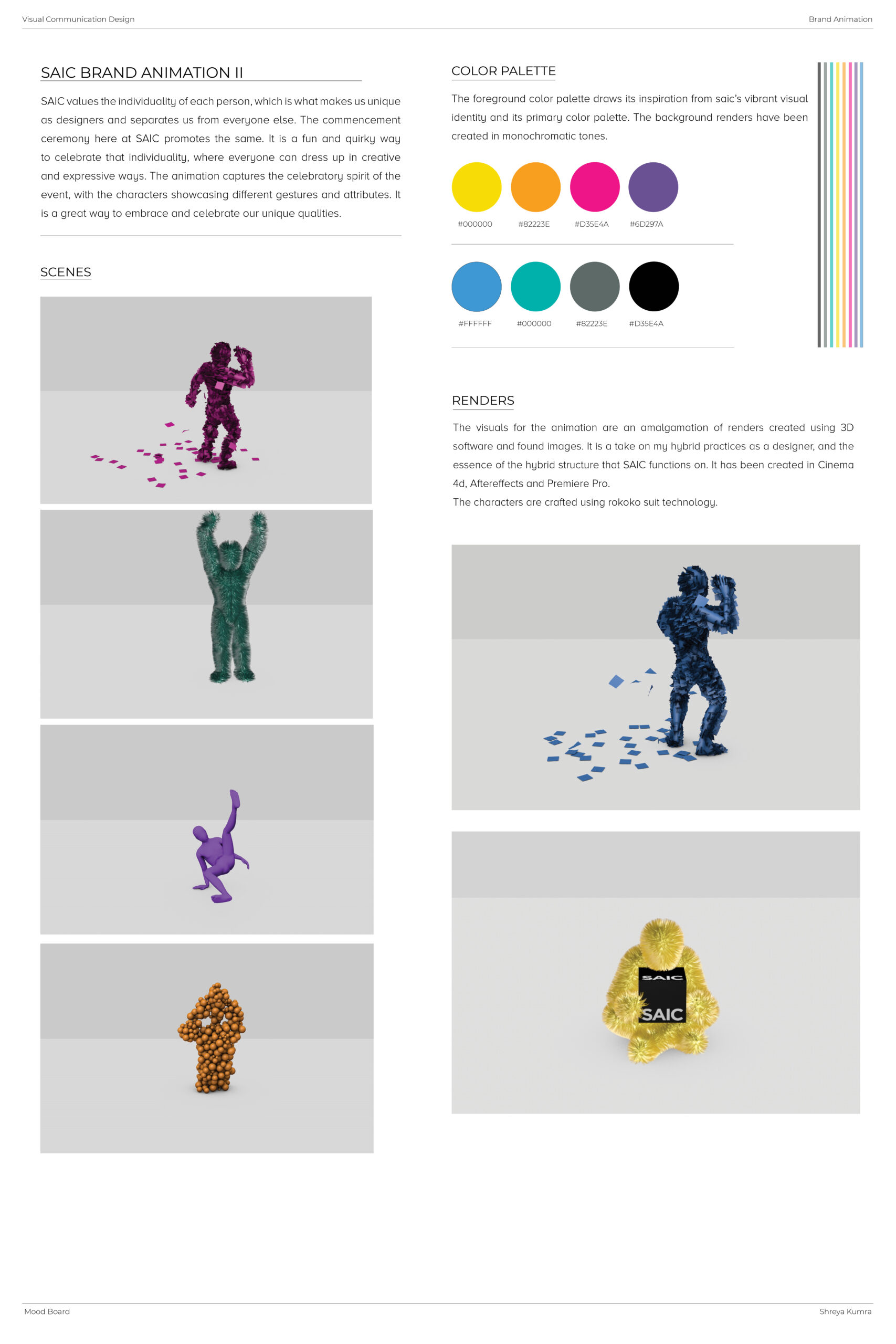 SAIC values the individuality of each person, which is what makes us unique as designers and separates us from everyone else. The commencement ceremony here at SAIC promotes the same. It is a fun and quirky way to celebrate that individuality, where everyone can dress up in creative and expressive ways. The animation captures the celebratory spirit of the event, with the characters showcasing different gestures and attributes. It is a great way to embrace and celebrate our unique qualities. Rokoko Suits and motion tracking sensors were used to build the various characters.